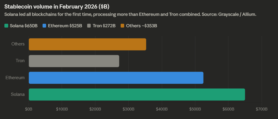 - Solana processed $650B in stablecoin volume in February 2026, the highest ever on any blockchain in a single month.
