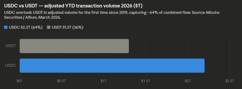 USDC has overtaken USDT in adjusted transaction volume for the first time since 2019, and that is a meaningful structural shift. But volume is not the whole picture.