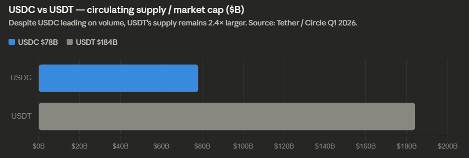 USDT still holds approximately $184B in circulating supply versus USDC's $78B. Moving more does not mean holding more, and in stablecoins, both metrics matter.