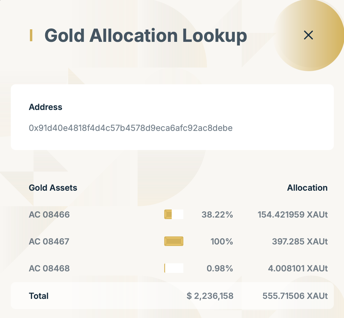 Another useful example is Tether’s gold-backed stablecoin XAUt, which represents one troy ounce of physical gold stored in a Swiss vault. On the XAUt website users can enter an Ethereum address and instantly see which specific gold bars their tokens correspond to.
